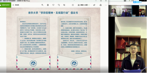 最后,学生会主席石凯向全体青年学生发起“学回信精神﹒见报国行动”倡议书 。活动直播在歌曲《青春为祖国歌唱:祖国不会忘记》优美旋律下结束。
