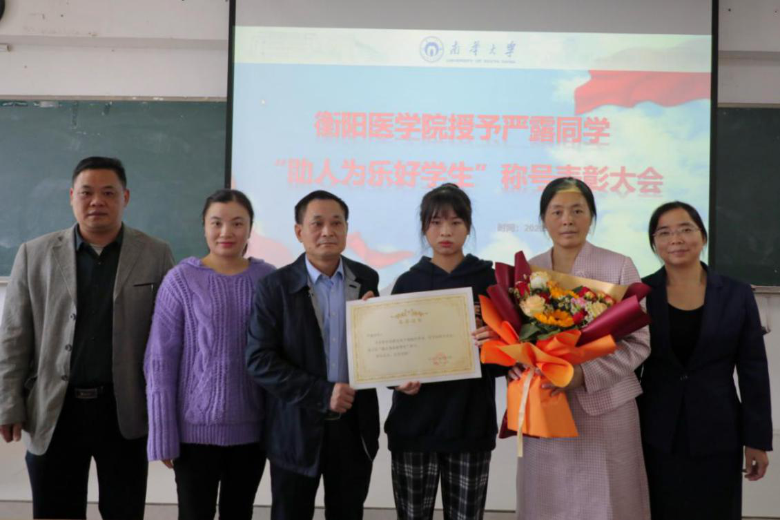 10月24日上午,衡阳医学院召开授予严露同学“助人为乐好学生”称号表彰大会。会上宣读了学习严露同学优秀事迹倡议书,衡阳医学院党委常务副书记陈端阳为严露颁发“助人为乐好学生“荣誉证书。