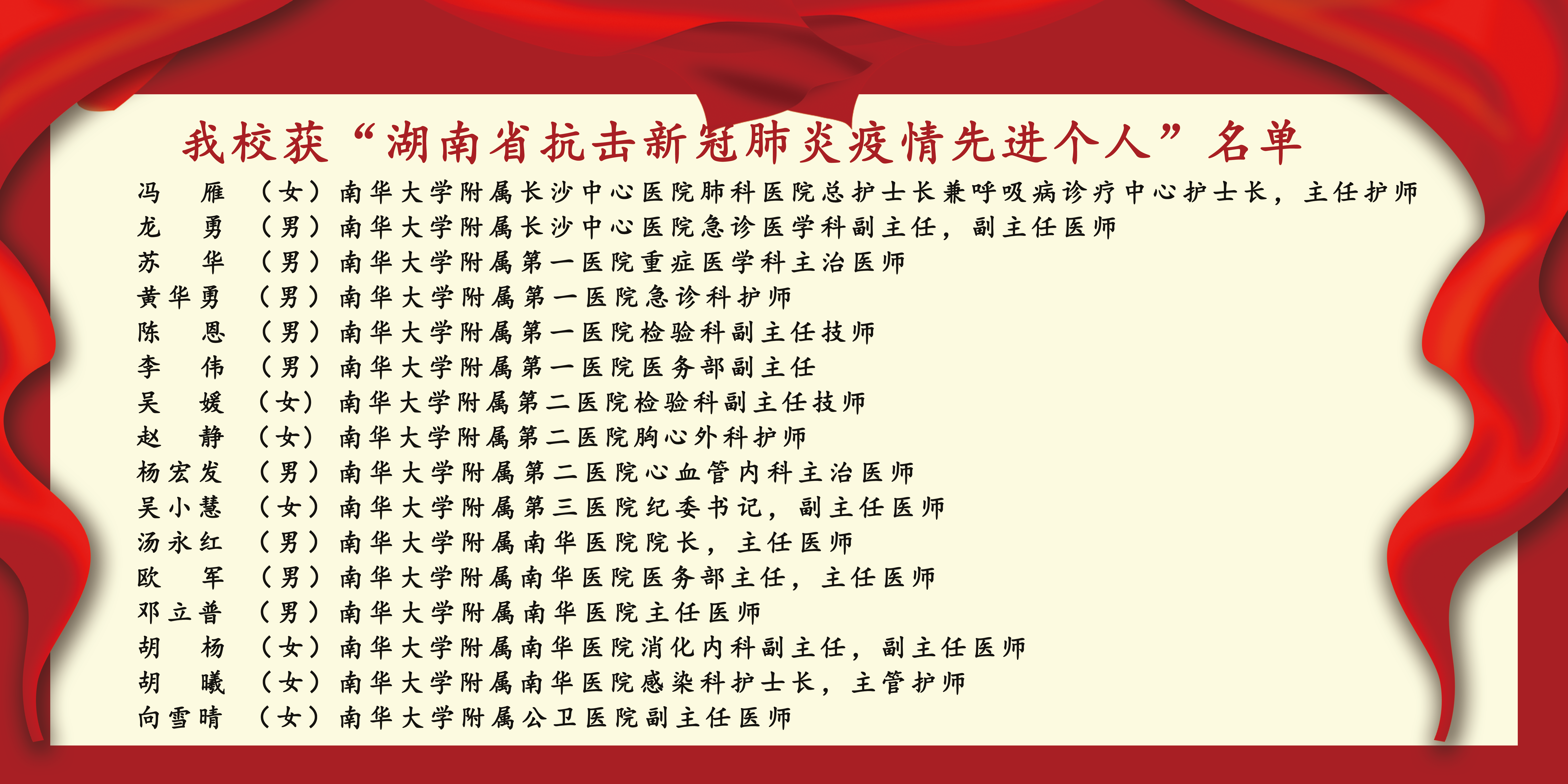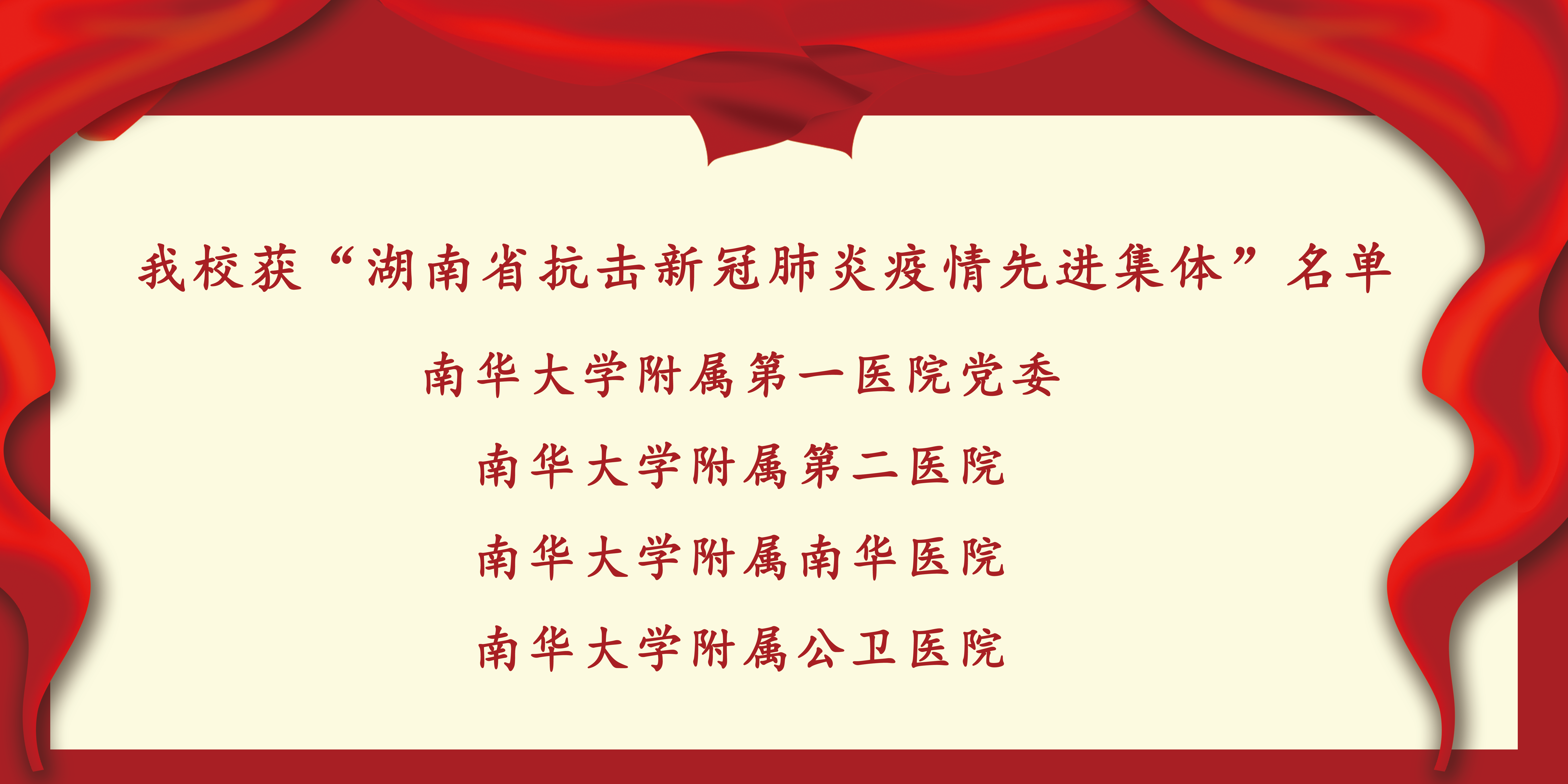 会上,我校各附属医院获多项表彰,其中共有16名医护人员荣获“湖南省抗击新冠肺炎疫情先进个人”称号;附属第一医院党委、附属第二医院、附属南华医院、附属公卫医院4所医院荣获“湖南省抗击新冠肺炎疫情先进集体”称号;附属长沙中心医院冯雁、附属第二医院杨宏发、附属南华医院邓立普3名医护人员荣获“湖南省优秀共产党员”称号;附属第一医院党委荣获“湖南省先进基层党组织”称号。