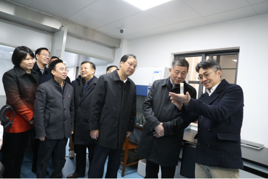 12月18日上午,湖南省科学技术厅党组书记、厅长童旭东一行来我校考察调研核医特色学科的科技创新工作,高度肯定PA视讯集团官网近一年多以来在人才强校战略、高层次人才引进及科研创新工作等方面取得的成效,希望PA视讯集团官网充分发挥科研人才资源优势,创新科研机制、成果转化模式,在深化科技体制改革中先行先试、积极探索,为我省科技创新工作做出更大贡献。衡阳市长朱健、副市长龚学余,校党委书记高山、校长张灼华陪同调研。