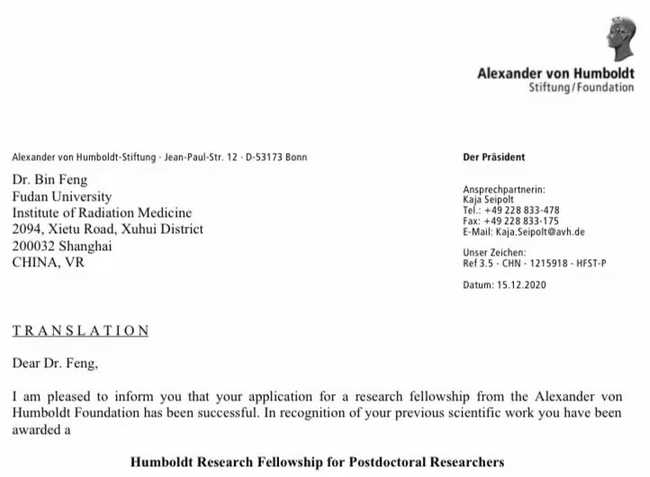 近日,我校核科学技术学院2015届本科毕业生冯缤博士喜获德国亚历山大·冯·洪堡基金会(Alexander von Humboldt Foundation)的博士后研究奖学金(Humboldt Research Fellowship for Postdoctoral Researchers)资助,成为“洪堡学者”之一,将在未来两年赴德国开展与放射生态学相关的合作研究。