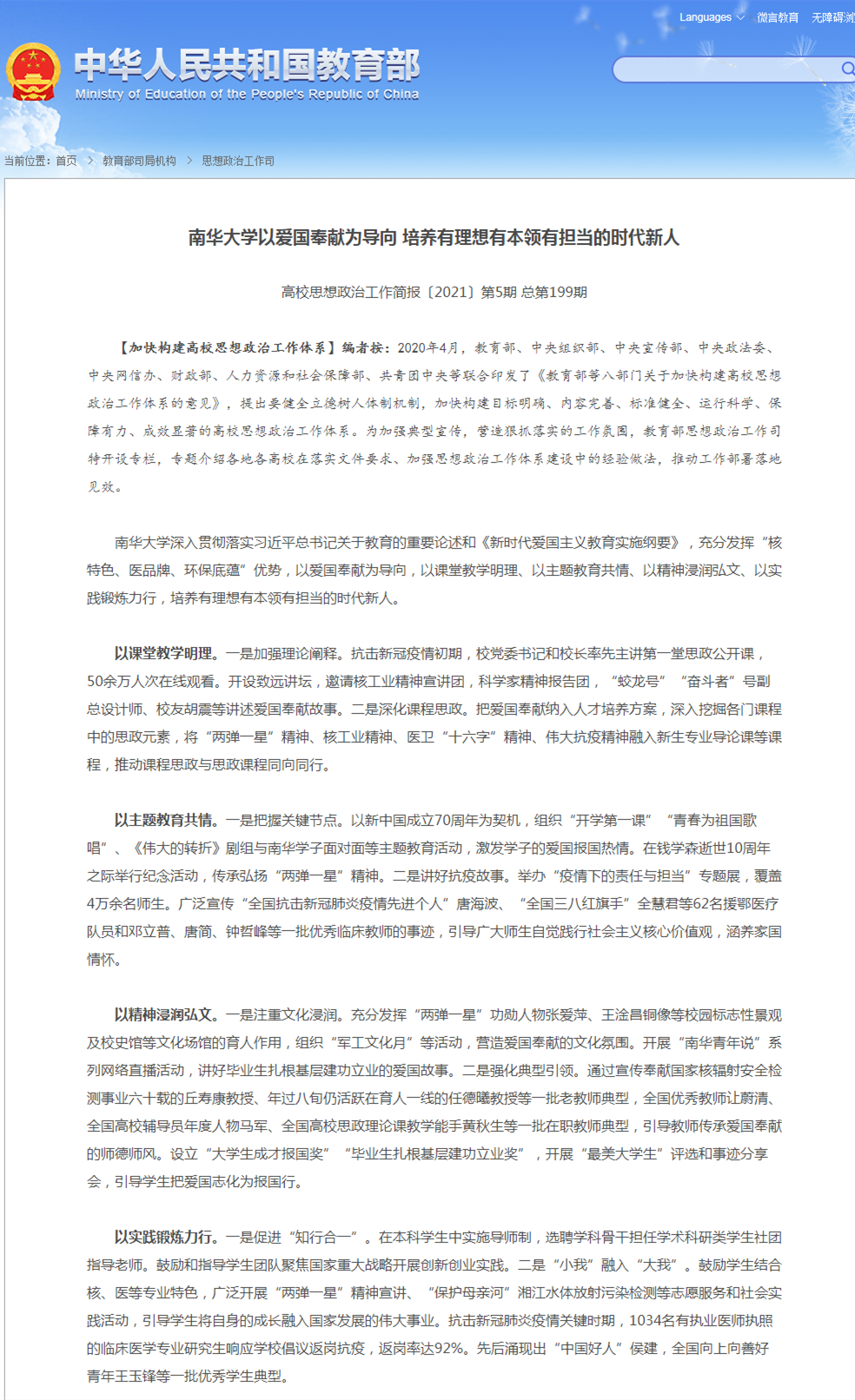 近日,教育部思政司《高校思想政治工作简报》2021年第5期刊发《PA视讯集团官网以爱国奉献为导向 培养有理想有本领有担当的时代新人》,专题推介我校思想政治工作举措、经验和成效。全文如下: