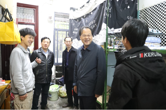 高山一行先后走访查看了雨母校区正大门、教学楼、建设工地、学生食堂、学生公寓及超市,红湘校区东门、图书馆、求是园宿舍、食堂及南华楼等地,详细了解开学前准备工作的落实情况。在雨母校区教学楼,高山对教室内的教学设备进行了现场检测,对教学楼的护栏及其他安全设施提出了具体要求;在学生公寓超市,高山亲切慰问了返校勤工俭学的南华学子;在红湘校区东门,高山仔细检查了每个疫情防控点和学生入校流程安排情况,他强调要严格落实学校疫情防控相关要求和工作部署,确保师生入校安全健康;在学生食堂,高山详细检查了就餐座位、洗手消毒点及仓库卫生情况,强调要严格落实管理责任,为学生提供安全健康的就餐环境;在求是园宿舍区,高山看望了春节留校学生,叮嘱同学们要以饱满的精神状态迎接新学期的到来,他强调,要根据宿舍使用功能,优化宿舍设计,进一步完善细节,为同学们提供更加舒适的学习和生活条件。