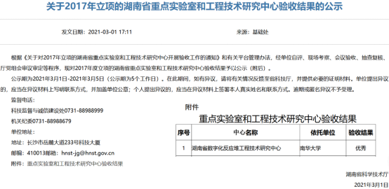 近日,湖南省科技厅下达《关于2017年立项的湖南省重点实验室和工程技术研究中心验收结果的公示》的通知,我校核科学技术学院于涛教授牵头主持建设的“湖南省数字化反应堆工程技术研究中心”顺利通过验收并获评“优秀”(排名1)。