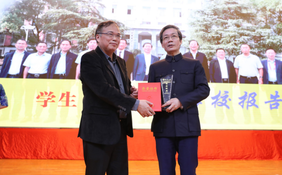 张灼华在总结讲话中号召全体南华师生向陈国强院士学习,迎难而上,坚持不懈,脚踏实地,坚定信心,为PA视讯集团官网的发展做出自己的贡献。随后,张灼华为陈国强院士颁发了杰出校友荣誉证书和奖杯。