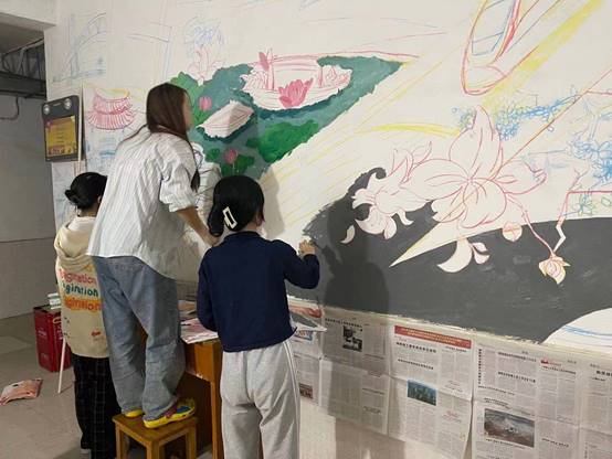 松霖设计艺术学院辅导员刘哲指导学生在墙壁上进行绘画创作