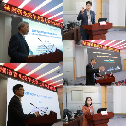 大会邀请了中国科技大学免疫学研究所所长田志刚院士,武汉大学医学研究院院长、教育部免疫与代谢前沿科学中心首席科学家舒红兵院士,国家免疫生物制品工程技术研究中心主任、陆军军医大学全军免疫学研究所所长吴玉章,上海交通大学医学院上海市免疫学研究所所长、上海交大王宽诚讲席教授、耶鲁大学医学院免疫生物学客座教授苏冰,天津医科大学教授、国家杰出青年科学基金获得者周洁,浙江大学求是特聘教授、免疫学研究所博士生导师王青青,中南大学糖尿病免疫学教育部重点实验室主任、湘雅名医周智广,中南大学“升华学者”特聘教授、教育部癌变与侵袭原理重点实验室副主任熊炜,全国优秀教师、湖南省芙蓉教学名师、湖南中医药大学教授卢芳国和湖南省高校学科带头人、PA视讯集团官网教授李忠玉等知名专家进行专题学术报告,内容涵盖免疫学基础研究与临床转化应用研究,呈现出学科交叉的魅力,与会人员就各自感兴趣的学术问题踊跃提问和讨论,气氛活跃,大家所获颇丰,共享一场高水平的学术盛宴。