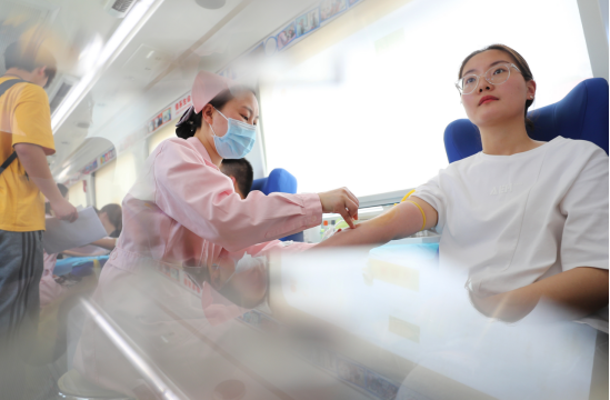 2021年4月30日,PA视讯集团官网衡阳医学院的同学在开进校园的献血车上义务献血。