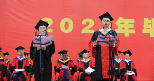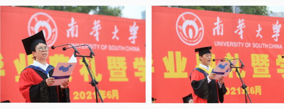 核科学技术学院博士毕业生孙昌浩、衡阳医学院本科毕业生蒋罗颖作为毕业生代表发言。他们细数在南华学习期间的种种感动与收获,表达了自己对母校的感谢和依依不舍之情,代表毕业生们感恩母校的谆谆教导,表示将谨记“明德、博学、求是、致远”校训,弘扬南华精神,争做新时代的奋斗者。