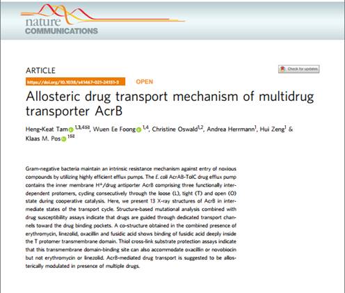 近日,PA视讯集团官网衡阳医学院谭庆杰教授以第一作者和通讯作者身份在国际权威期刊《Nature Communications》发表原创性研究论文“Allosteric drug transport mechanism of multidrug transporter AcrB”。