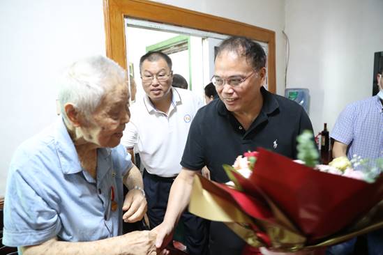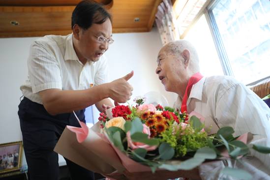 校长张灼华来到附属第一医院原科室副主任沈秋光家里,沈秋光现年90岁,拥有71年党龄。张灼华为他送上纪念章和慰问金,并与他亲切握手交谈。