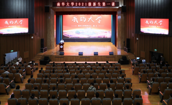 “正如习近平总书记所言‘奋斗是青春最亮丽的底色’,伟大时代需要我们勇挑中华民族的伟大复兴重任,用我们的热血、我们的奋斗来成就我们壮丽的青春。”9月16日上午,在南华礼堂以“我的大学”为题为南华2021级全体本科新生上开学第一课的校党委书记高山在课堂开始前这样激励新生。