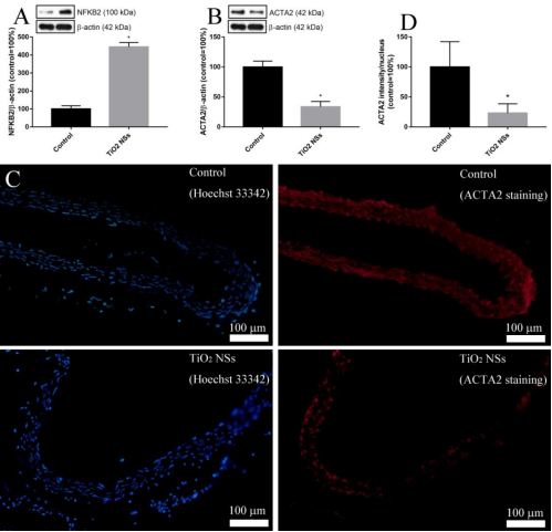 图2.二氧化钛纳米片对小鼠血管NFKB2和ACTA2蛋白的影响