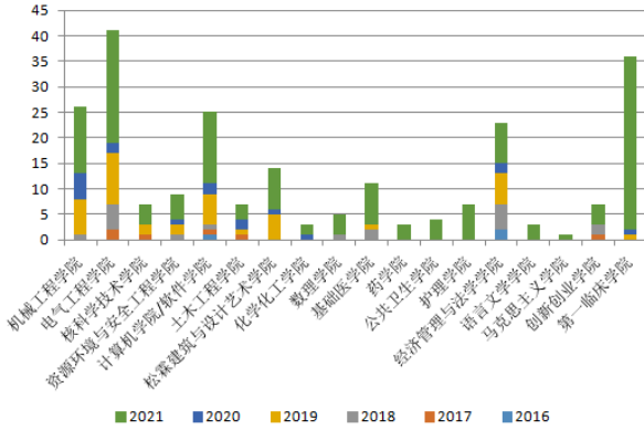 图2:各学院教育部产学合作协同育人项目累计立项数年度统计