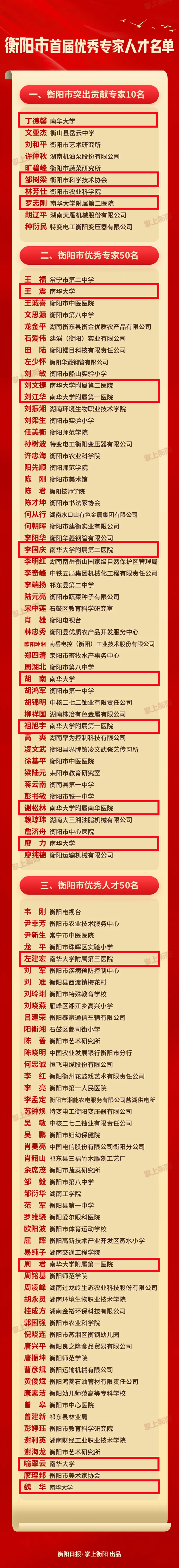 据悉,本次入选优秀专家人才分为3个梯队,分别是10位衡阳市突出贡献专家、50位衡阳市优秀专家和50位衡阳市优秀人才,覆盖科学技术、教育教学、医疗卫生、文化艺术、农业农村、经营管理、劳动技能7大行业领域。其中,突出贡献专家均扎根衡阳20年以上,入选过国家级人才支持计划或获得过国家级荣誉奖项,代表了衡阳各行业领域的最高专业水平,为衡阳经济社会发展作出过突出贡献。