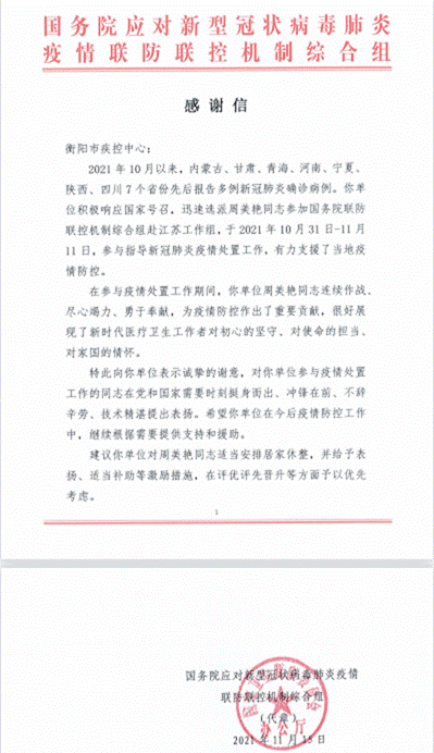 近日,衡阳市疾病预防控制中心收到国务院应对新型冠状病毒肺炎疫情联防联控机制综合组的一封表扬我校学生周美艳的感谢信,信中评价:“你单位周美艳同志连续作战、尽心竭力、勇于奉献,为疫情防控作出了重要贡献,很好展现了新时代医疗卫生工作者对初心的坚守、对使命的担当,对家国的情怀。”