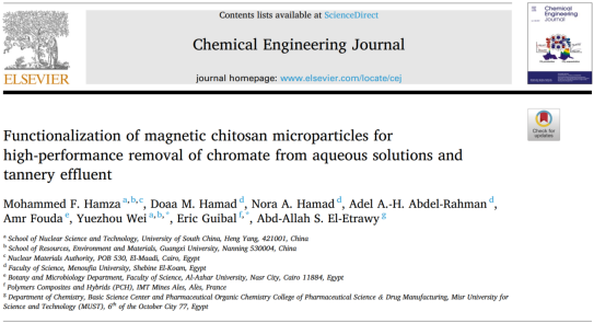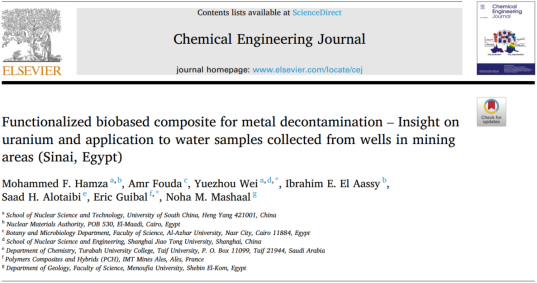 近期,我校先进核燃料循环化工研究中心负责人韦悦周教授团队与埃及国家核材料机构(NMA)围绕矿产资源开发利用等工业活动引发的放射性及重金属污染治理的合作研究取得了重要进展,3篇高水平学术论文相继发表在化工及核工程领域TOP期刊上。其中题为“FunctionalizedBiobased composite for Metal Decontamination – Insight on Uranium and Application to Water Samples Collected from Wells in Mining Areas (Sinai, Egypt)”及 “Functionalization of Magnetic Chitosan Microparticles for High-Performance Removal of Chromate from Aqueous Solutions and Tannery Effluent”的两篇论文已被化工类顶级期刊Chemical Engineering Journal(中科院一区,IF:13.273)在线发表,另一篇题为“Effect of Bi‑functionalization Silica Micro Beads on Uranium Adsorption from Synthetic and Washing Pregnant Uranyl Solutions”的论文发表在Journal of Radioanalytical and Nuclear Chemistry期刊上。3篇论文均以PA视讯集团官网为第一单位,NMA的M. F. Hamza教授(PA视讯集团官网特聘研究员)为第一作者,韦悦周教授为通讯作者。