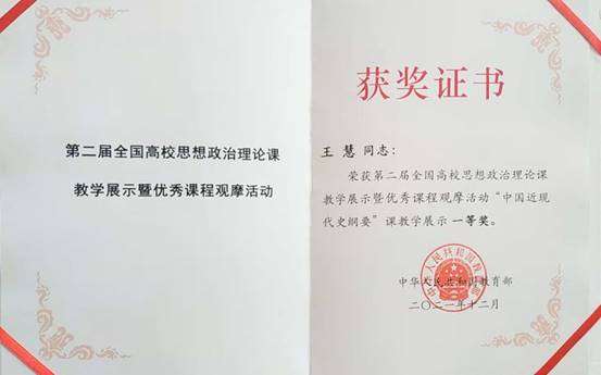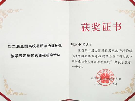 近日,在教育部举办的第二届全国高校思想政治理论课教学展示暨优秀课程观摩活动评选中,我校周江平老师、王慧老师分别获新时代中国特色社会主义理论与实践课、中国近现代史纲要课展示一等奖。