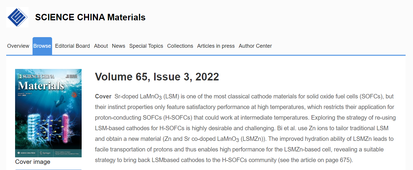 近期,我校毕磊教授团队研究发现,通过Zn元素的掺杂使得第一代Sr-LaMnO3阴极可以在质子导体固体氧化物燃料电池中展现出优异的性能,相关成果发表在2022年3月刊的《中国科学材料》(SCIENCE CHINA Materials)期刊上,以期刊封面论文的形式发表题为“High-performance proton-conducting solid oxide fuel cells using the first-generation Sr-doped LaMnO3cathode tailored with Zn ions”的研究论文,并被《中国科学材料》期刊的官方微信公众号进行推送宣传。这是该团队在质子导体固体氧化物燃料电池材料研究中取得的又一成果。