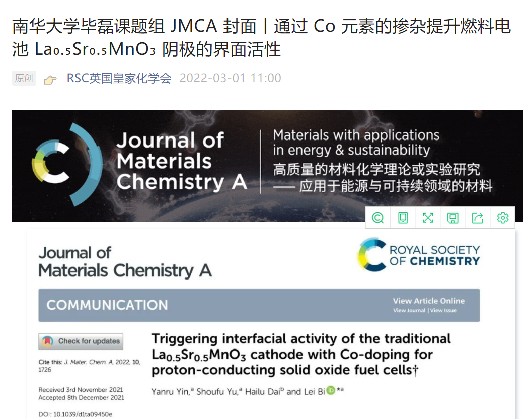 他的相关研究成果受到了领域内的广泛关注,发表于Journal of Materials Chemistry A期刊的论文(Triggering interfacial activity of the traditional La0.5Sr0.5MnO3cathode with Co-doping for proton-conducting solid oxide fuel cells, J. Mater. Chem. A, 10, 2022, 1726-1734)被英国皇家化学会(RSC)官方微信以头条的形式进行报道,并且被选为期刊的热点论文。发表于Electrochemistry Communications期刊的论文“Sintering aids for proton-conducting oxides - A double-edged sword? A mini review”成为该期刊年度引用最多的论文之一。