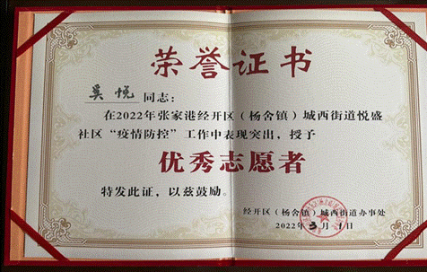 奚悦获得街道办事处颁发的“优秀志愿者”荣誉证书