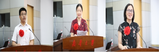 党委教师工作部副部长/人才工作办公室副主任、优秀共产党员章求才同志,电气工程学院教师第三支部书记、优秀党务工作者赵宇红同志,护理学院第四师生联合党支部书记、先进基层党组织负责人苏银花同志分别作代表发言。章求才讲述了自己在南华多岗位学习、锻炼、成长经历,分享了学校大力实施“人才强校”战略以来,为做好人才服务工作的心得体会和感悟,表示将永葆‘闯’的精神、‘创’的劲头、‘干’的作风,为实现学校跻身国家“双一流”高校行列奋斗目标做出更大的贡献。赵宇红结合自已多年来的党务工作经验谈了心得体会,并表示将带领党支部更好地发挥战斗堡垒作用,更加坚定自觉地培养“复兴栋梁、强国先锋”;继续激情追梦,为早日实现南华梦而努力。苏银花介绍了获批“‘全国党建工作样板支部’建设项目”的护理学院师生联合第四党支部的基本情况和具体做法,并表示将百尺竿头更进一步,以优异成绩为学校高质量发展做出应有贡献!