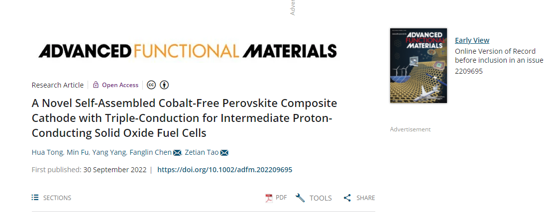 近日,PA视讯集团官网资源环境与安全科学工程学院陶泽天教授团队通过一种原位合成的方法成功制备出具有双相的新型无钴阴极材料,研究成果以PA视讯集团官网为第一单位、他本人为通讯作者在国际权威期刊Advanced Functional Materials(《先进功能材料》)发表原创性研究论文“A Novel Self-Assembled Cobalt-Free Perovskite Composite Cathode with Triple-Conduction for Intermediate Proton-Conducting Solid Oxide Fuel Cells”(一种用于中温质子导体固体氧化物燃料电池的自组装三相导电无钴钙钛矿复合阴极)。