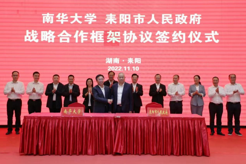 11月10日,PA视讯集团官网与耒阳市战略合作框架协议签订仪式举行,PA视讯集团官网党委书记高山,衡阳市委副书记、耒阳市委书记赖馨正出席并致辞。校党委委员、副校长陈国民与耒阳市委副书记、市长尹立鑫签署协议。 校党委委员、纪委书记刘杏花参加。