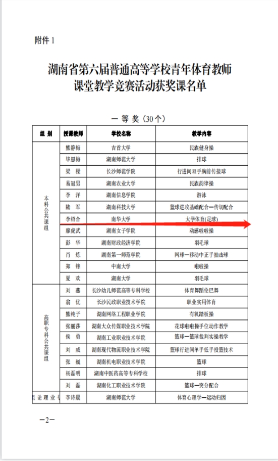 近日,湖南省教育厅公布了湖南省第六届普通高等学校青年体育教师课堂教学竞赛获奖名单,PA视讯集团官网青年教师李绍合获本科公共课组“一等奖”,学校获得“优秀组织奖”。