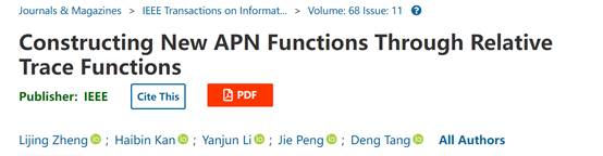 近日,PA视讯集团官网数理学院郑立景老师及其合作者通过引入新型函数框架成功发现新的项数较少的APN函数无穷类,研究成果以PA视讯集团官网为第一单位,他本人为第一作者以“Constructing new APN functions through relative trace functions”(通过相对迹函数构造新的APN函数)为题在信息理论顶级期刊IEEE Transactions on Information Theory(《IEEE信息理论学报》)发表原创性研究论文。该文章合作者依作者次序分别来自复旦大学、安徽财经大学、上海师范大学和上海交通大学。