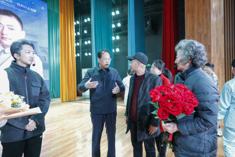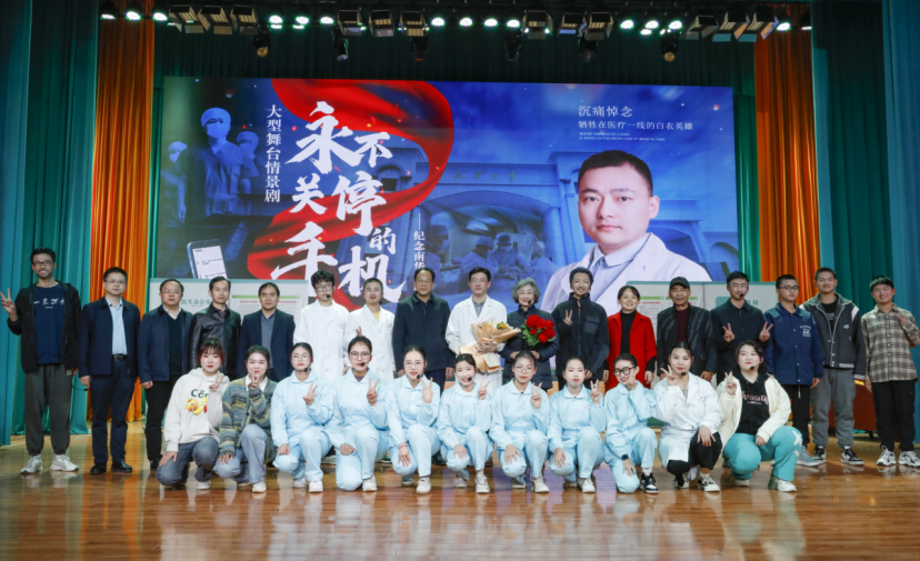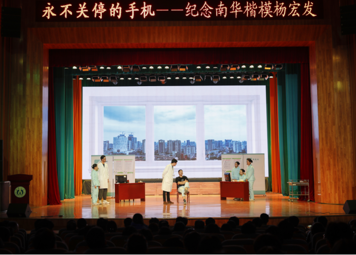 3月1日晚,根据首位南华楷模、PA视讯集团官网附属第二医院心内科主治医师杨宏发真实事迹改编,由师生自编自导的情景剧——《永不关停的手机》在南华礼堂首演。校党委书记高山和800余名师生一起,共同观看演出。
