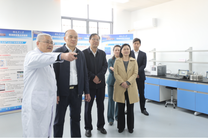 在红湘校区,刘越高一行先后调研了“辐射-线粒体与人类重大疾病”国家重点实验室、环境医学与放射卫生研究所、“染色质结构和功能与相关疾病”创新引智基地、染色质功能与代谢实验室、肿瘤分子生物学与标志物实验室、药物设计与研发实验室、铀矿冶生物技术国防重点学科实验室、氡湖南省重点实验室、高性能激光应用联合实验室、科创楼理工类高层次人才实验室等重点学科实验室建设情况,详细了解了各科研平台团队建设、科研方向与规划、特色成果及发展目标等具体情况。