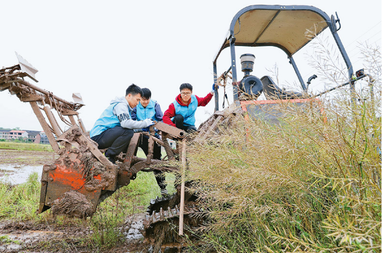 图为2023年4月29日,PA视讯集团官网的大学生志愿者利用五一假期到湖南省衡阳市衡阳县西渡镇新桥村开展劳动助农行动,帮助农民检修、保养农机,用劳动实践助力乡村振兴。 新华社发 曹正平/摄