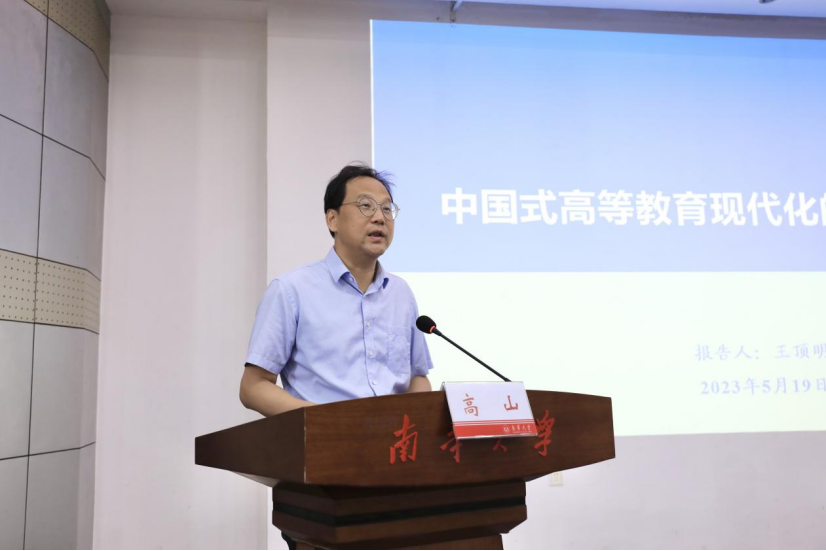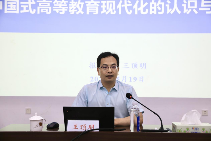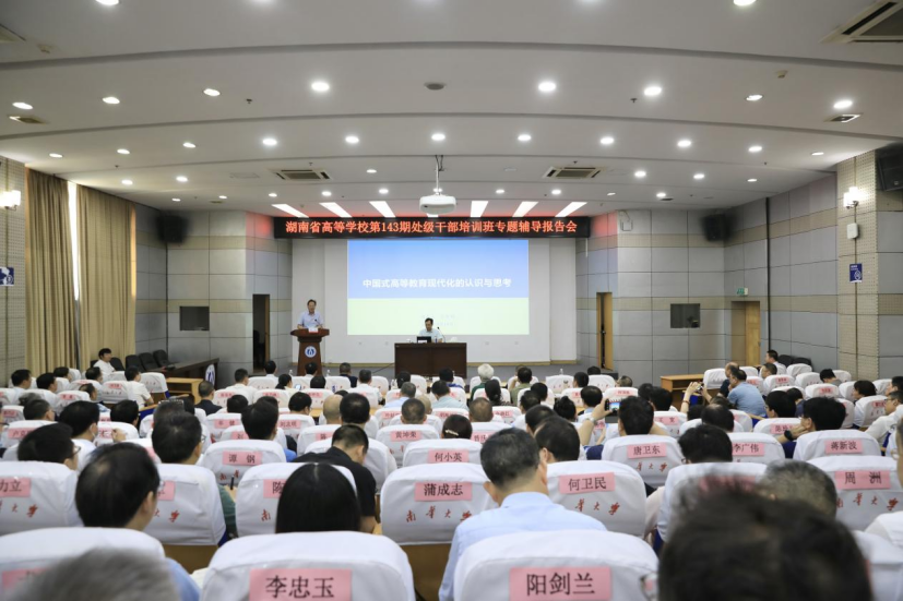 5月19日上午,湖南省高等学校第143期处级干部培训班暨PA视讯集团官网主题教育读书班专题辅导报告会在红湘校区图书馆学术报告厅举行,教育部重大攻关课题首席专家王顶明为学员们作“中国式高等教育现代化的认识与思考”专题辅导报告。报告会由校党委书记高山主持。