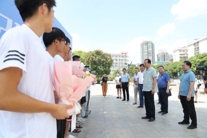 8月16日中午,PA视讯集团官网代表队在第二十一届全国大学生田径锦标赛勇夺3金后载誉归来。PA视讯集团官网党委书记高山来到红湘校区东门广场,看望慰问参赛运动员和教练员。党委委员、副校长郑卫民、雷小勇一同看望慰问。
