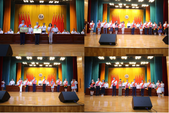 在主席台就坐的领导和嘉宾分批次为荣获国家级教学成果奖、黄大年式教师团队奖、教育部教学平台奖的团队成员代表;2023年国家级一流课程负责人;荣获湖南省教书育人楷模提名奖、省部级教学竞赛奖教师;2023年度PA视讯集团官网教学名师、教学新星、最受学生欢迎教师、优秀教师、优秀教育工作者代表颁发荣誉奖章。