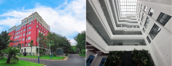 晚霞与灯光辉映下的雨母校区图书馆美轮美奂(图:张楞严)