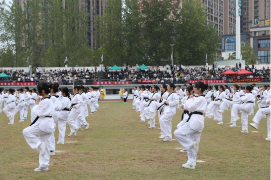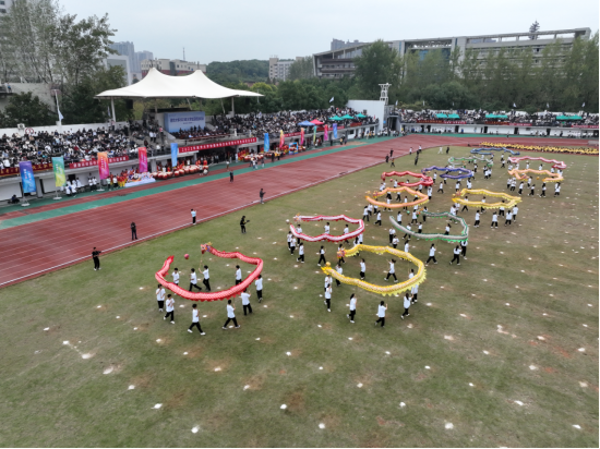 裁判员代表彭春兰、运动员代表罗婉仪宣誓后,裁判员、运动员退场,大型文体表演正式开始。表演分为鼓舞、团体操、武术、龙狮表演四部分,鼓舞《绽放》以大气雄浑的节奏为主旋律配以整齐划一的欢呼声、口号声,充分展现南华学子积极进取、勇攀高峰的毅力与精神。团体操表演队员的每一次跳跃都尽显南华学子年轻的活力与张扬。武术表演中,跆拳道、少林传统拳表演者用迅猛的动作,展现了力量与速度。行云流水的剑术、眼花缭乱的双刀、虎虎生风的枪术相继上演,现场掌声不断。龙狮表演中,巨龙时而翻腾扭转,醒狮时而昂首阔步,把龙、狮生动的神态展现得淋漓尽致,高超技艺赢得了现场群众的阵阵喝彩,充分展示了中华传统优秀文化的底蕴和魅力,激励着全校师生开拓进取、团结合作、自强不息。