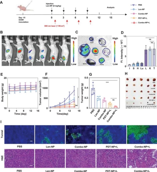 研究人员通过动物实验评估了Combo-NP的生物安全性、生物分布和抗肿瘤活性。结果显示,经Combo-NP+L处理的小鼠肿瘤组织中出现较大的核碎裂、核溶解。同时,TUNEL检测提示,Combo-NP+L组小鼠肿瘤组织中绿色荧光强度明显高于其他组小鼠肿瘤组织。通过实验发现Combo-NP+L对肿瘤生长的抑制作用最强。