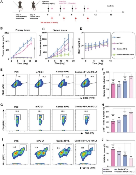 联合应用Combo-NP和α-PD-L1 mAb可诱导B16F10皮下肿瘤模型的全身抗肿瘤效应