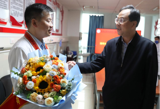 在附属第一医院门诊大楼,高山看望慰问了全国五一劳动奖章获得者、附属第一医院重症医学科副主任医师苏华,向他的辛勤工作和卓越贡献表示敬意,并送上了鲜花。苏华医生作为附属第一医院重症医学科(中心ICU)的副主任医师,曾获评湖南省抗击新冠疫情先进个人、2023年湖南省五一劳动奖章。他从事重症医学专业22年,扎根临床一线医疗工作,以其卓越的医术和崇高的医德,赢得了社会的广泛赞誉。高山鼓励大家向先进典型学习,大力弘扬劳模精神、劳动精神、工匠精神,做脚踏实地的奋斗者,为学校“双一流”建设贡献力量。