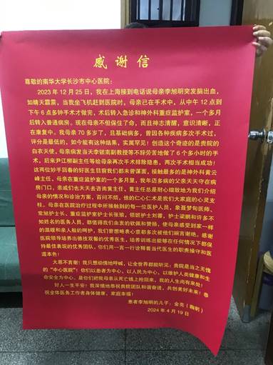 这封感谢信用真挚的言辞,表达了对医院全体医护人员的感激之情,以及对医院优质医疗服务的高度认可。从信中得知,长沙市民金亮的母亲李旭明(70多岁),于2023年12月25日突发脑出血,在长沙市中心医院手术,术后转入急诊和神经外科重症监护室,一个多月后转入普通病房。现在,李旭明神志清醒,意识清晰,正在康复。因李旭明基础病多,因病经历过多次手术,家属认为:其治疗效果实属罕见。