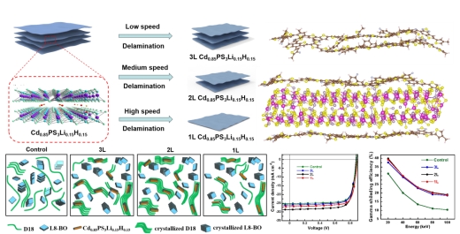 在过去的十年里,OPV由于其生产成本低、重量轻、材料丰富和机械灵活性,在新兴光伏领域展示出巨大的潜力。虽然OPV在器件工程方面取得了重大进展,OPV的最高认证PCE超过19%,但是该PCE还不能满足OPV大规模商业化的需求。二维晶体由于其优异的高载流子迁移率、高吸收系数和合适的价带位置,可以用作实现有效电子级联转移的掺杂剂。众所周知,二维晶体的层数会显著影响其光电特性,但是二维晶体层数对OPV器件性能的影响尚未得到广泛关注与研究。因此,优化二维晶体层数并深入理解其层数对OPV成膜机制的影响对实现OPV器件性能的突破至关重要。