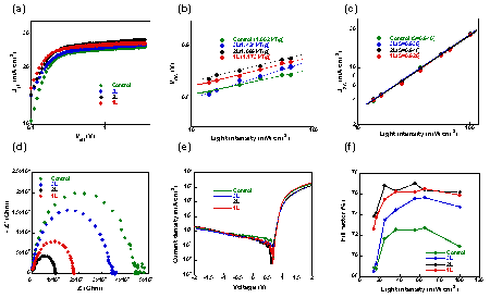 研究人员探讨了不同层数二维Cd0.85PS3Li0.15H0.15掺杂剂作用于OPV器件的物理机制。结果表明,基于双层 Cd0.85PS3Li0.15H0.15掺杂的OPV器件能够在促进激子产生和解离方面达到平衡,不会增加陷阱辅助的单分子复合,能抑制器件的双分子复合,从而提高了器件光电流。同时,基于双层 Cd0.85PS3Li0.15H0.15掺杂的OPV器件削弱了体电荷复合,有效填充了D18:L8-BO活性层的陷阱,降低了器件的漏电流,从而基于双层 Cd0.85PS3Li0.15H0.15掺杂的OPV器件具有最大的填充因子。