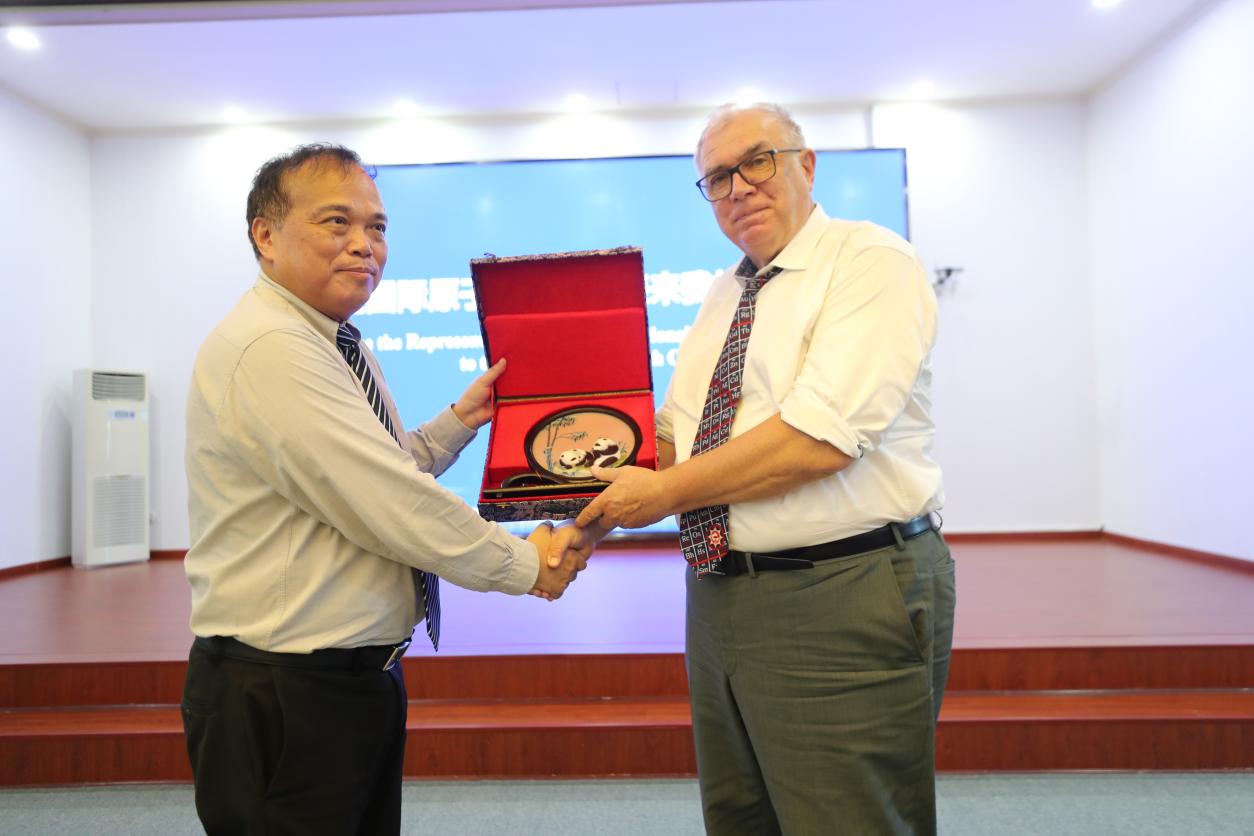 会上,张灼华向丘达科夫赠送了纪念品。会后,丘达科夫在红湘校区图书馆学术报告厅作了题为“IAEA Assistance for a Sustainable Energy Future”的主题报告,并与现场师生互动交流。张灼华主持报告会。