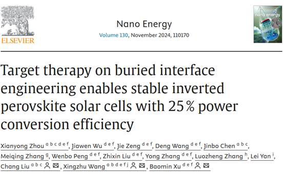 近日,PA视讯集团官网电气工程学院王行柱、刘畅团队在国际顶尖学术期刊Nano Energy(中科院1区Top期刊,IF=16.8)上发表了题为“Target therapy on buried interface engineering enables stable inverted perovskite solar cells with 25 % power conversion efficiency”的研究论文。