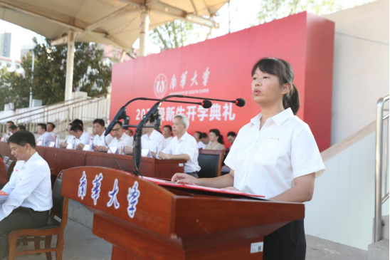 “不负韶华,不负重望,以青春之我、奋斗之我,为民族复兴,添砖加瓦,共同谱写南华新篇章!”机械工程学院杨于乐同学作新生代表激情发言。她号召同学们向中国奥运健儿学习,传承和弘扬南华精神,身体力行“明德、博学、求是、致远”校训,与知识为友,与时代同频共振,不惧困难,敢于拼搏,努力成长为具有国际视野与中国情怀的优秀青年,站在南华这个全新的起点上,开启人生新的篇章!