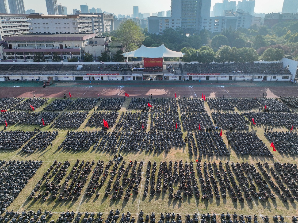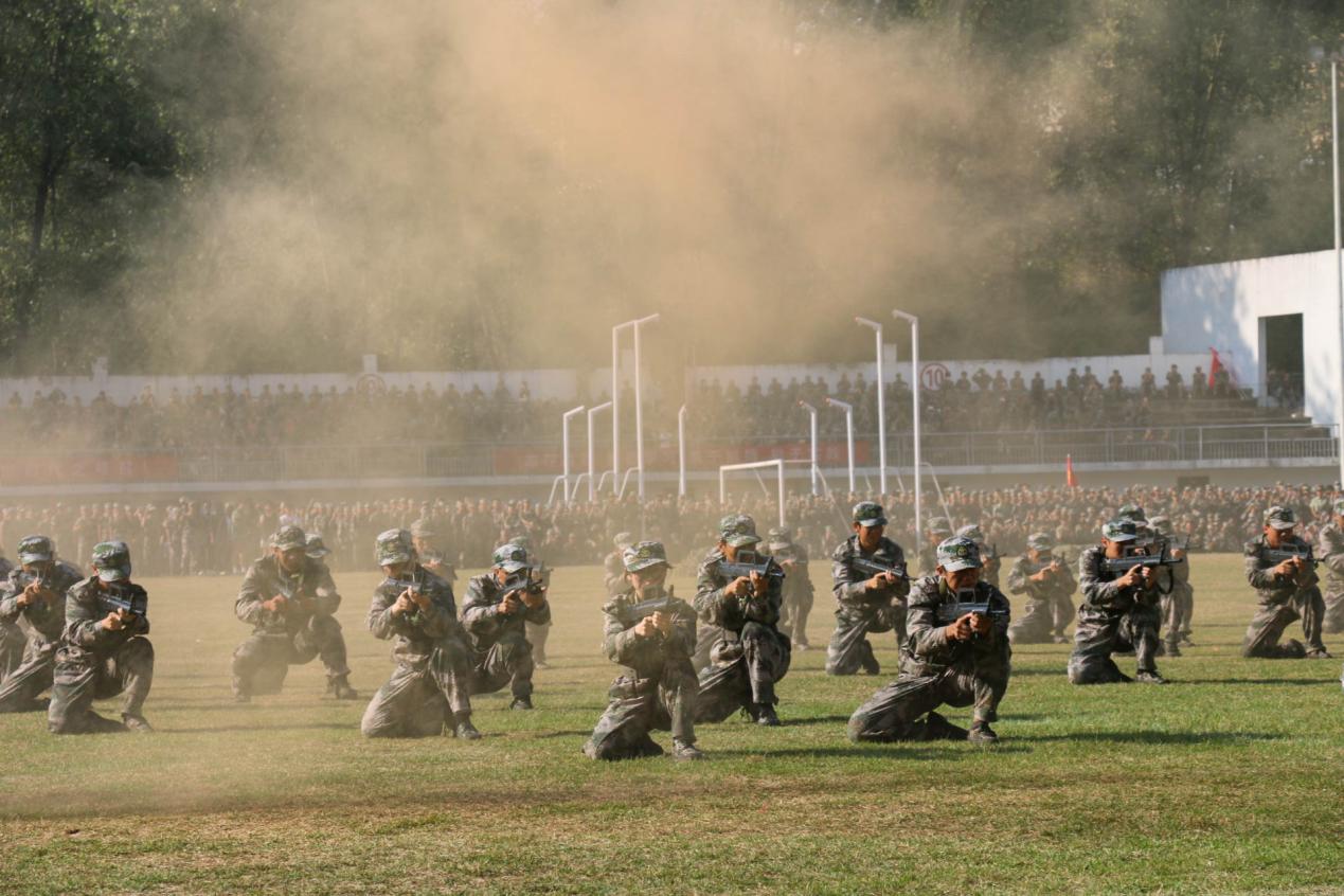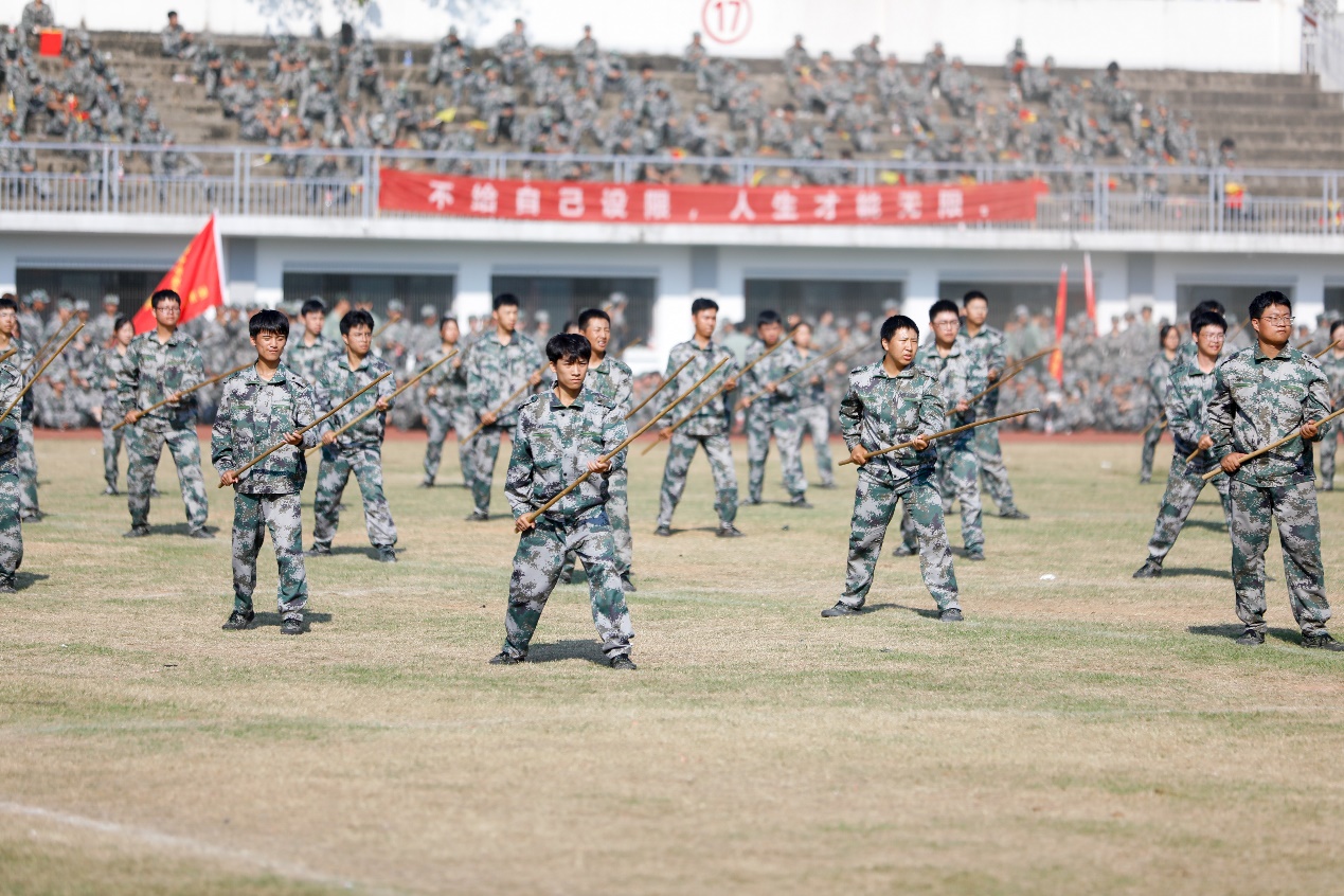 随后,军训成果汇报表演开始。分列式汇演率先登场,操场上各方阵如林立的松柏,队列严整,步伐铿锵有力。新生们以满腔的热情和不屈的斗志,依次通过主席台接受检阅。擒敌拳虎虎生威、气势磅礴,匕首操英姿勃发、锐不可当,旗语表演灵动真实,棍棒术敏捷矫健、气势恢宏,团体操活力四射、整齐划一,战术表演及战场救护逼真紧张,同学们在模拟实战中展现迫击炮操作、手雷投掷、战术行进、解救人质、救护伤员等技能,军训科目演练充分展现了南华学子“勤勉务实、甘于奉献、刚健自强、敢为人先”的精神面貌,赢得了现场师生的阵阵掌声和欢呼声。