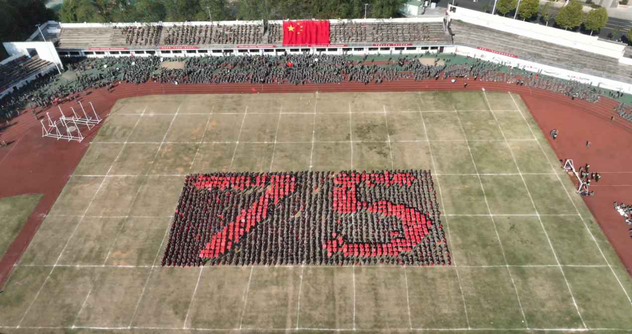 伴随着歌曲《我的祖国》悠扬的旋律,巨幅国旗在运动场看台徐徐展开,1500余名受训新生在操场上不断变换手中的红色卡片,摆出“南华欢迎你”“听党话、跟党走”“不忘初心、牢记使命”“1949、2024、75”“祖国万岁”等文字和数字,庆祝中华人民共和国成立75周年,表达南华学子浓浓的爱党爱国爱校之情。