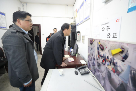 在应急指挥中心视频监控室,高山详细询问了视频监考人员通讯设备管理及应急通讯工具保障情况,强调要严格规范视频监考流程,强化人员进出管理,确保考务工作各个环节万无一失。